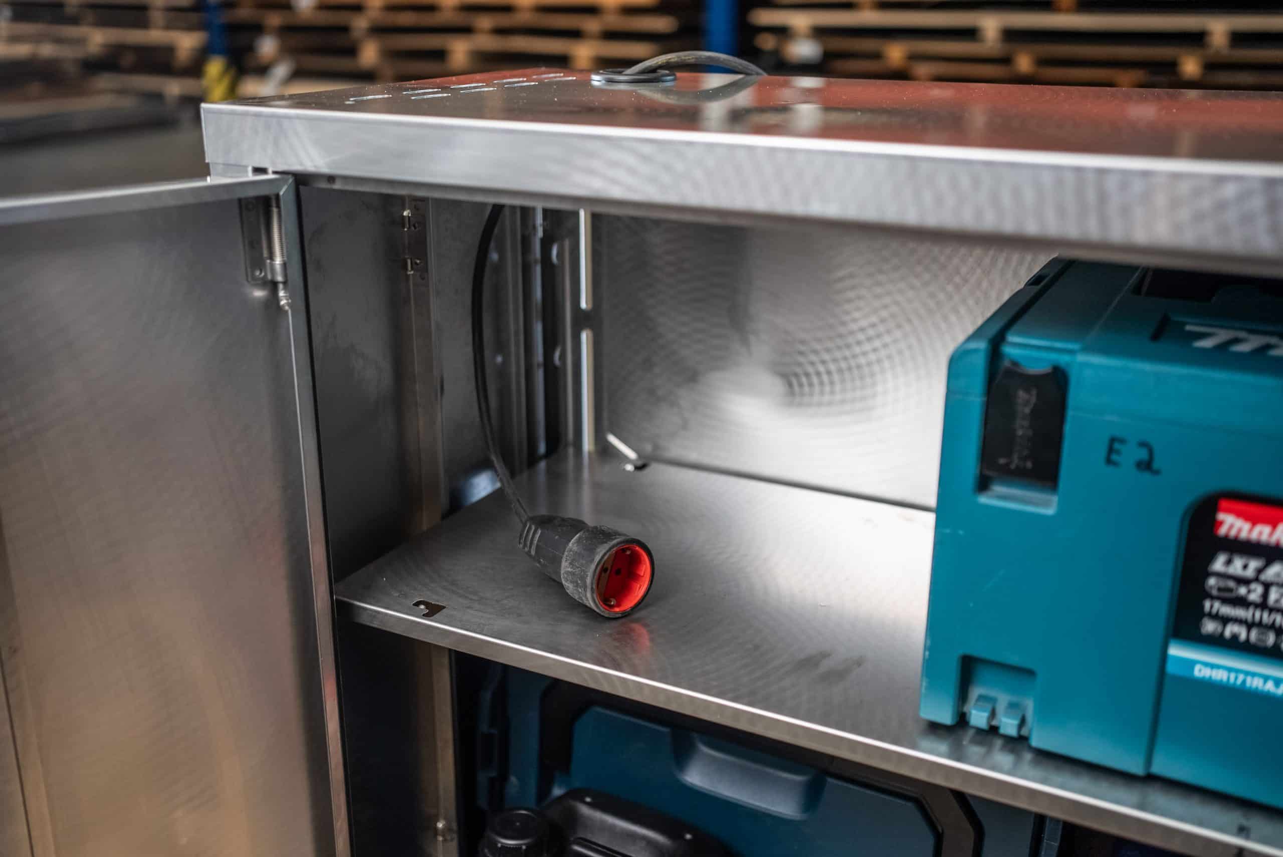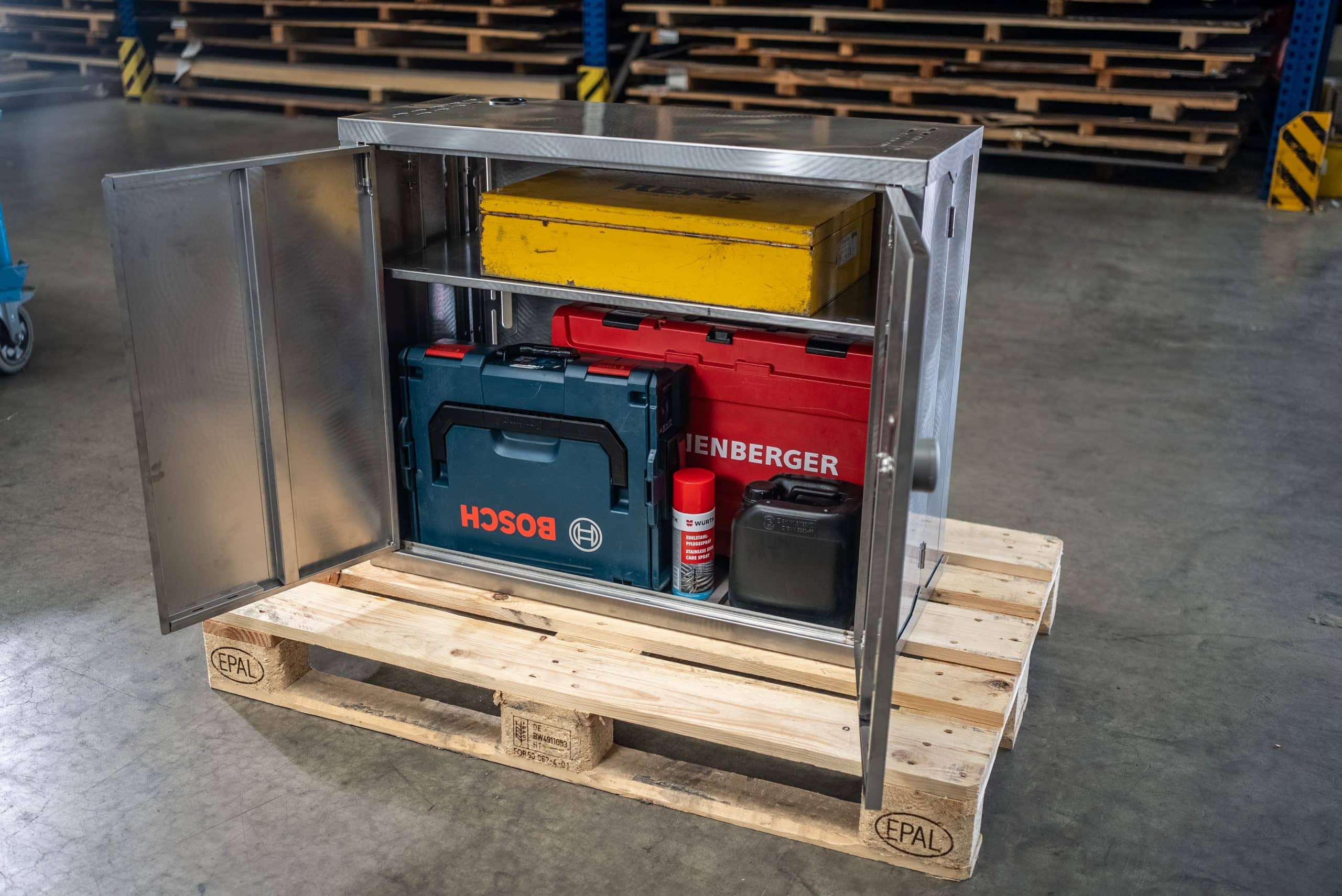 Diese Herausforderung führte zur Entwicklung eines mobilen, klappbaren Baustellenschranks. Gemeinsam mit einem starken Partner aus der Metallverarbeitungsbranche entstand Schritt für Schritt ein Produkt, das höchsten Ansprüchen gerecht wird. Nach zahlreichen Prototypen fiel die Wahl auf Edelstahl – langlebig, nachhaltig und absolut robust.